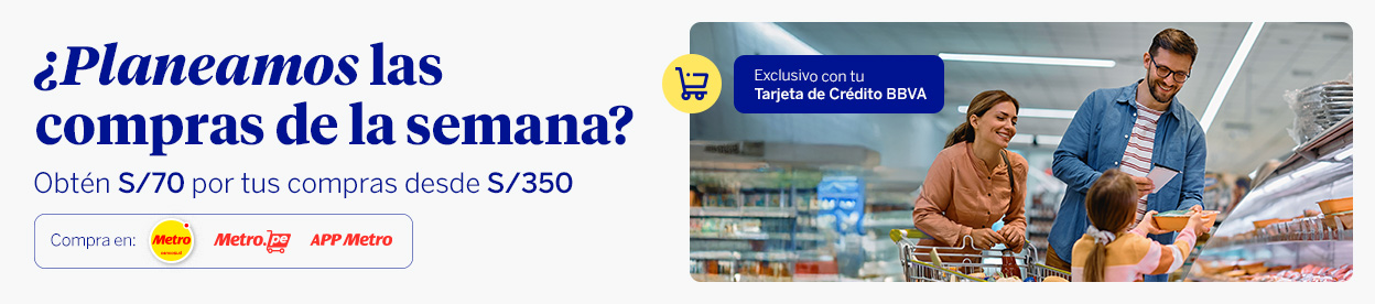 Promoción válida del 01 al 30 de noviembre de 2025 Fondo promocional de S/ 231,000 soles. Aplica para pagos con Tarjeta de Crédito BBVA. S/70 soles de devolución por cliente en compras en Metro a partir de S/350 soles que se realicen en tiendas físicas, www.metro.pe, App Metro a nivel nacional. Válida exclusivamente todos los sábados y/o domingos comprendidos del 01 al 30 de noviembre del 2025. El beneficio y requisitos (incluyendo la inscripción) también aplica para las tarjetas adicionales. Los consumos de cada fin de semana (sábados y/o domingos) son acumulativos o podrán realizarse en una sola transacción por el monto mínimo de la campaña. El cliente podrá participar cada fin de semana durante la vigencia de la campaña. No se podrá acumular consumos entre una semana y otra. Para participar, el cliente deberá inscribirse antes de realizar su compra en el formulario: https://form.bbva.pe/app/